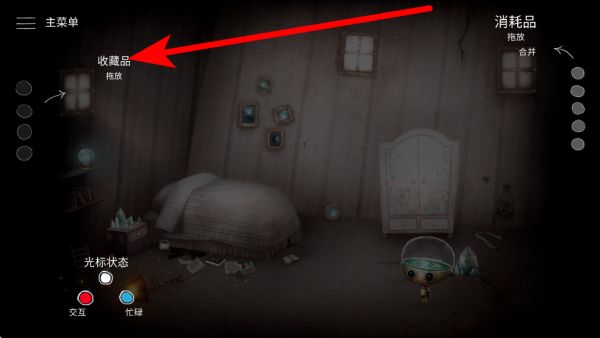 2、界面左側(cè)有收藏品欄,可通過拖放操作來整理收集到的物品,這些收藏品或許在后續(xù)解謎過程中起到重要作用,要仔細(xì)收集并妥善管理。