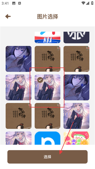 3、在圖片選擇頁面,選中想要的圖片后,點擊選擇,回到照片制作頁面。