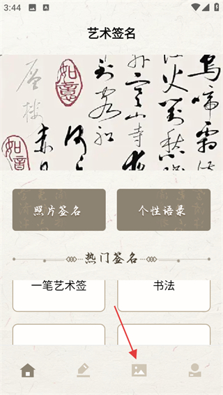 1、進(jìn)入藝術(shù)簽名頁面,點(diǎn)擊底部圖片圖標(biāo),進(jìn)入藝術(shù)壁紙頁面。