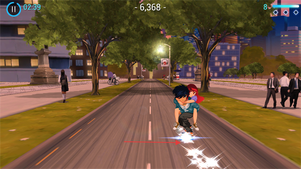1、游戲開始,操控角色在道路上滑行,留意屏幕上方的倒計時如02:39和分數如-6,368。