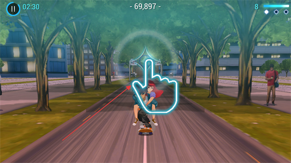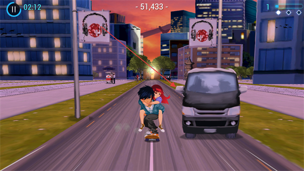 3、滑行過程中,注意躲避前方出現的障礙物如車輛,保證角色安全。