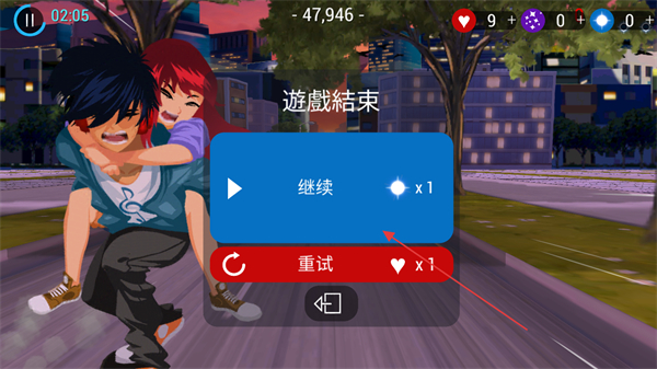 4、若游戲結束,出現遊戲結束界面,點擊繼續(xù)消耗鉆石續(xù)關,或點擊重試重新開始游戲。