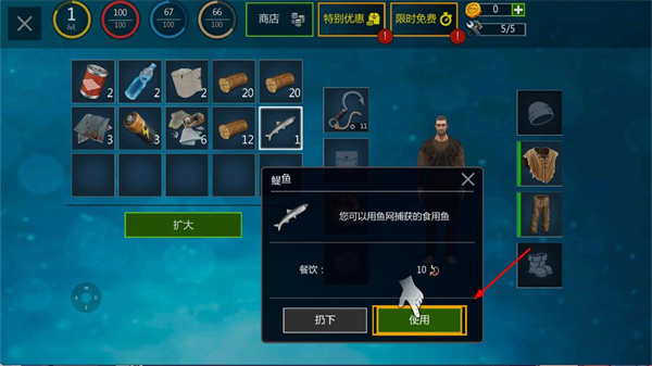 1、在背包中,可對(duì)捕獲的魚(yú)進(jìn)行使用等操作,利用魚(yú)肉維持生存。