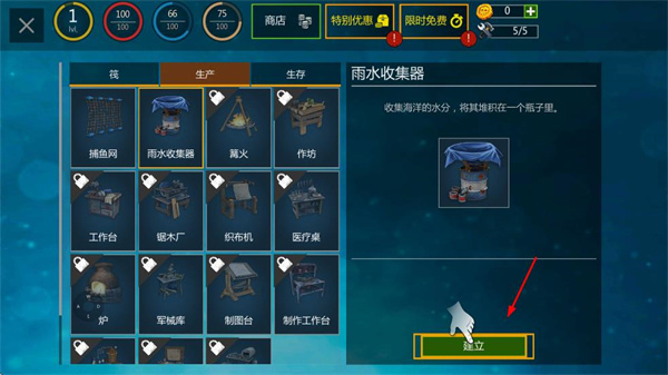 2、在生產(chǎn)菜單中,可建立雨水收集器等生存設(shè)施,用于收集海水的水分。