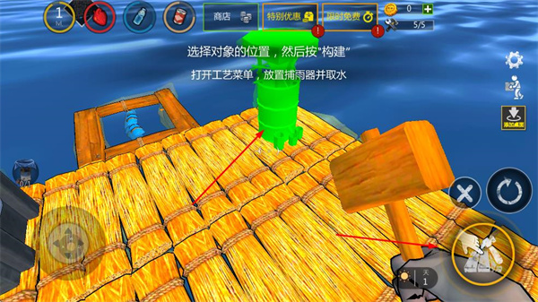 3、在木筏上,選擇位置放置捕雨器等設(shè)施,按構(gòu)建打開(kāi)工藝菜單,放置后可汲取水。
