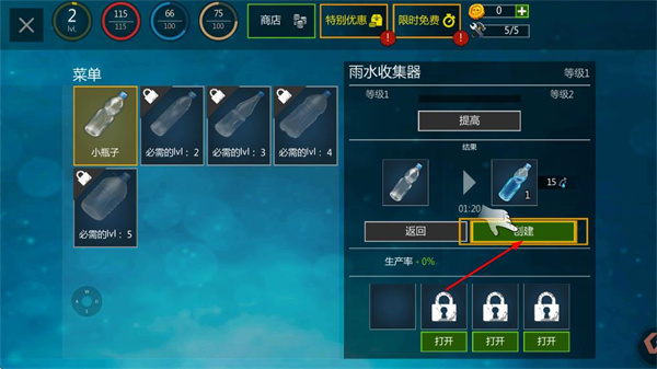 4、通過(guò)雨水收集器,消耗材料創(chuàng)建小瓶子等容器,用于儲(chǔ)存收集到的水,保障水資源供應(yīng)。