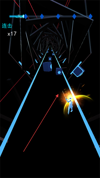 2、按照方塊飛來的方向和角度,點擊屏幕操控角色揮劍擊打方塊,獲取連擊數(shù)如連擊x17。