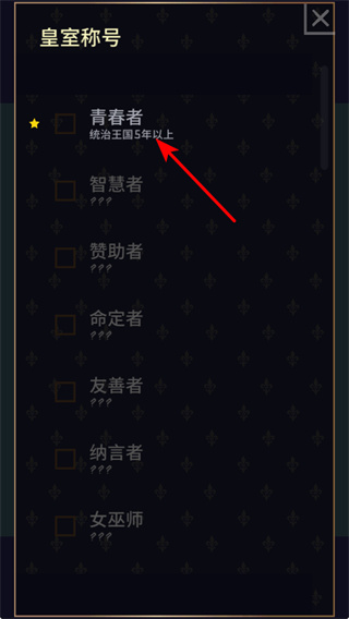 4、獲取稱號,完成青春者等稱號解鎖條件如統(tǒng)治王國5年以上,獲取皇室稱號,提升角色聲望。
