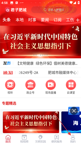 1、進(jìn)入君子肥城首頁,點(diǎn)擊底部我的,進(jìn)入個(gè)人頁面。