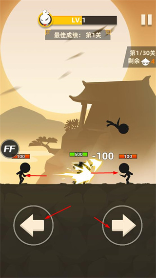 1、在戰(zhàn)斗場景中,通過點擊左右方向按鈕,操控火柴人移動,與敵人進行戰(zhàn)斗,攻擊敵人可造成傷害。