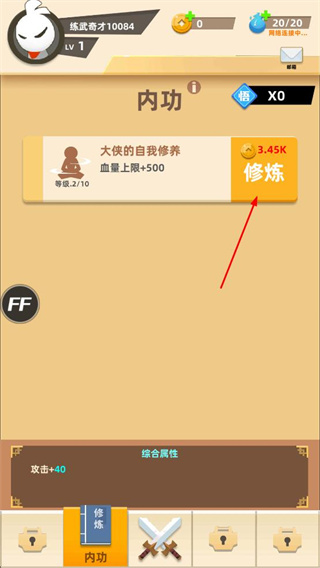 2、進入內(nèi)功界面,可消耗金幣修煉,如大俠的自我修養(yǎng)能提升血量上限,增強角色能力。