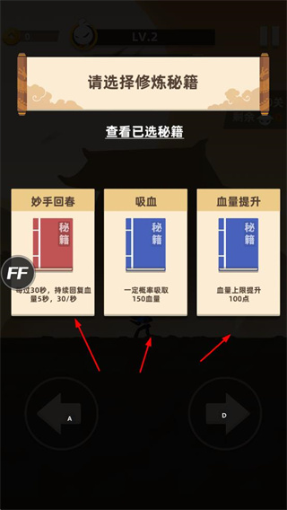 3、選擇修煉秘籍,有妙手回春、吸血、血量提升等,助力戰(zhàn)斗。