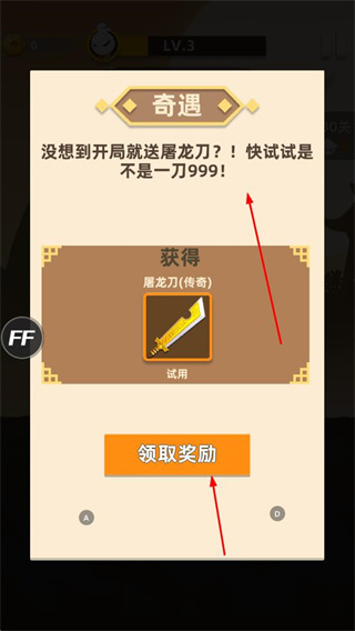 4、會有奇遇,可獲得如屠龍刀等武器,點擊領取獎勵獲取,試用武器提升戰(zhàn)斗實力。