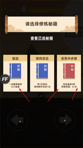 2、選擇修煉秘籍,有吸血、背向攻擊、含笑半步顛等,助力戰(zhàn)斗能力提升。