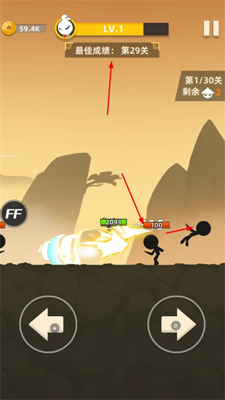3、在戰(zhàn)斗場景中,操控火柴人攻擊敵人,積累關卡進度,界面會顯示最佳成績等關卡信息,激勵挑戰(zhàn)更高關卡。