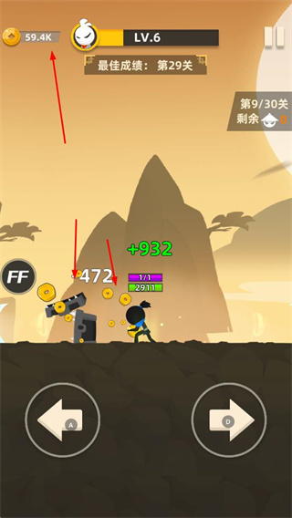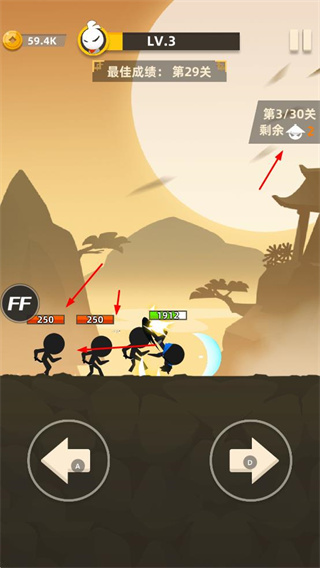 4、戰(zhàn)斗時,火柴人攻擊敵人可造成傷害并獲取金幣等獎勵,界面會顯示最佳成績等關(guān)卡信息。