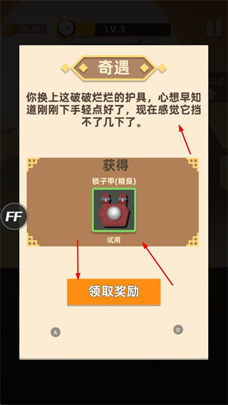 2、會有奇遇,可獲得如鎖子甲等裝備,點擊領(lǐng)取獎勵獲取,試用裝備提升戰(zhàn)斗防御等能力。