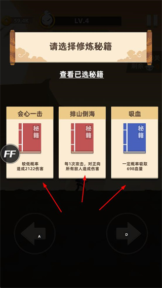 3、選擇修煉秘籍,有會心一擊、排山倒海、吸血等,助力戰(zhàn)斗。