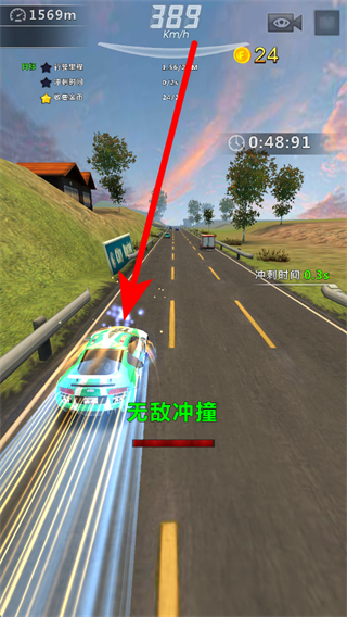 2、行駛中觸發(fā)無敵沖撞效果時,可借助該效果,更順利地在道路上馳騁,突破關(guān)卡。