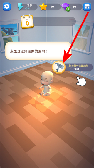3、按照指引,點擊對應圖標,可免費為寶寶添加第一張嬰兒床,開始對寶寶的房間進行初步升級。