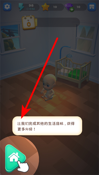 4、關注生活目標提示,完成各類生活目標,獲取更多升級所需的資源,不斷升級寶寶的房間與生活設施,見證寶寶成長。