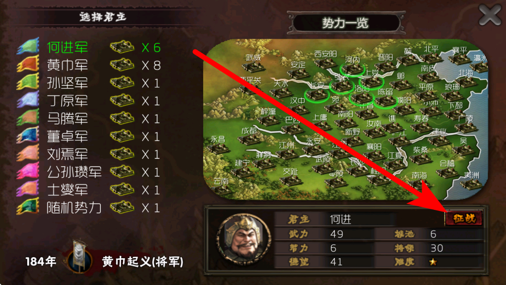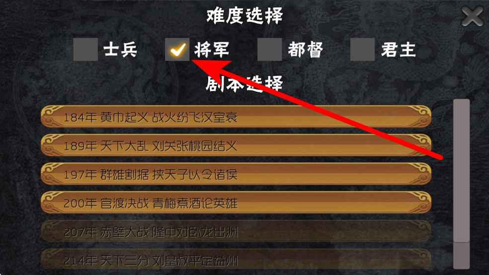 1、進(jìn)入后,選擇難度與劇本,比如將軍難度和184年黃巾起義劇本,再挑選君主與勢力,點擊征戰(zhàn),開啟策略征程。