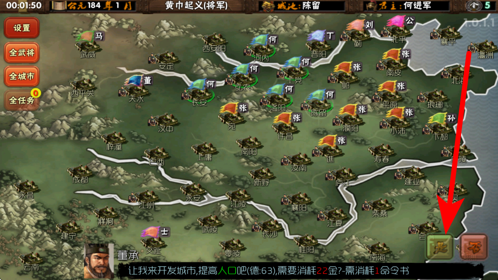 4、在城市管理中,可進(jìn)行開發(fā)城市等操作,消耗資源提升城市人口等,同時也可運用謀略,調(diào)遣軍隊征戰(zhàn),拓展勢力范圍。