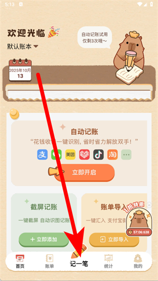 首頁設(shè)計簡潔直觀,點擊“記一筆”即可快速進入記賬界面,常用功能一鍵觸達,無需復(fù)雜操作,新手也能在10秒內(nèi)完成一筆收支記錄。