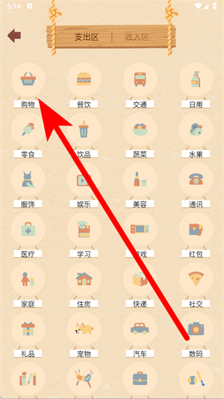 2、在支出區(qū)頁面,點擊購物圖標。