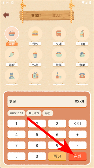 4、信息填寫好后,點擊完成按鈕,記錄該筆購物支出。