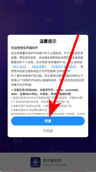 1、打開變聲器大師軟件,在彈窗中點擊同意。