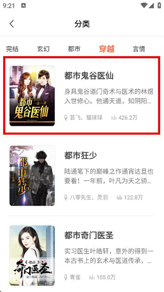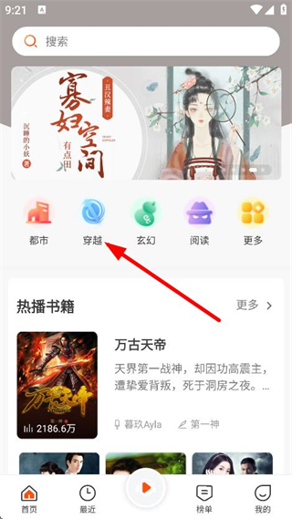 1、在聽書王軟件首頁,點(diǎn)擊穿越分類,進(jìn)入穿越類書籍列表頁面。