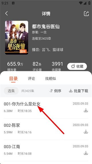3、在書籍詳情頁面,點(diǎn)擊要收聽的章節(jié),進(jìn)入章節(jié)播放頁面。