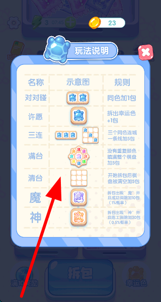 3、閱讀玩法規(guī)則說明,熟悉對(duì)對(duì)碰三連等機(jī)制,按照規(guī)則進(jìn)行操作,提升游戲進(jìn)程推進(jìn)效率。