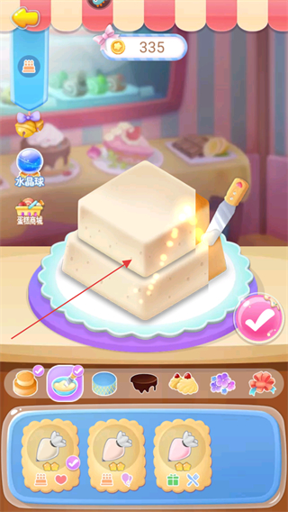 1、進(jìn)入制作界面,查看屏幕上方的金幣數(shù)量如335,從下方材料欄選擇蛋糕胚堆疊。