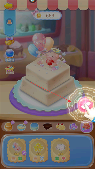 2、根據(jù)關(guān)卡要求,從材料欄選取裝飾品如氣球、玩偶裝飾蛋糕。