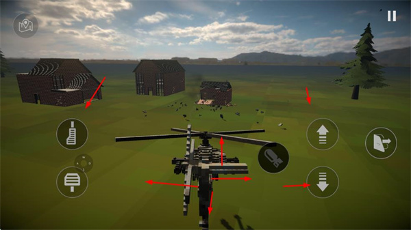 1、可操控直升機(jī),利用界面上的方向按鈕調(diào)整飛行方向和高度,向brick建筑發(fā)起攻擊,破壞建筑。