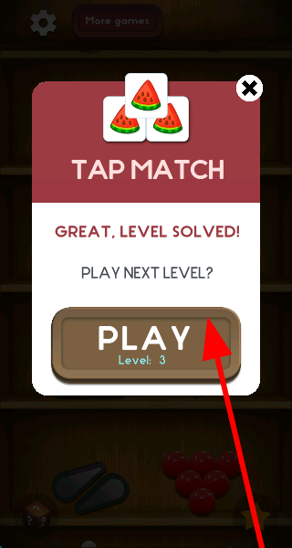 4、成功通過(guò)當(dāng)前關(guān)卡后,會(huì)出現(xiàn)PLAY按鈕,點(diǎn)擊它就能進(jìn)入下一關(guān),繼續(xù)水果卡牌消除挑戰(zhàn)。