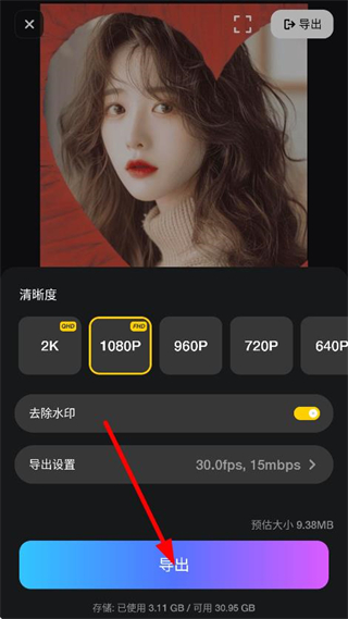4、在導出設置頁面,設置清晰度等參數后,點擊導出,導出編輯好的內容。