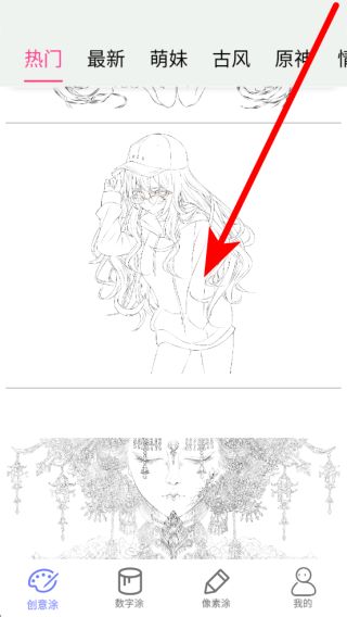 1、進(jìn)入應(yīng)用后,在熱門創(chuàng)意涂等板塊挑選喜歡的線稿,比如帶有人物形象的線稿,選定后即可開始后續(xù)涂色操作。