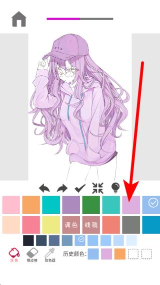 2、選好線稿進(jìn)入涂色界面,下方有顏色面板,點擊想要的顏色,像淺紫色等,就能為線稿相應(yīng)區(qū)域涂色。