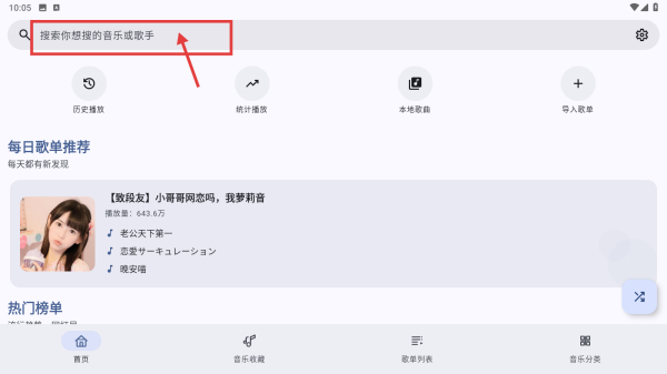 1、打開音樂應(yīng)用,點(diǎn)擊頂部搜索框,進(jìn)入搜索欄目。