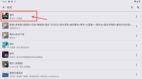 2、在搜索結(jié)果中,找到周杰倫演唱的晴天條目,點(diǎn)擊搜索。