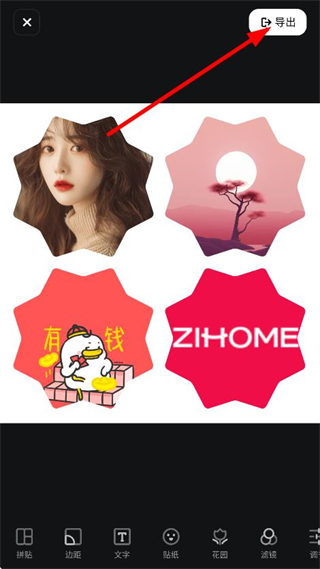 3、在拼貼編輯頁(yè)面,編輯完成后,點(diǎn)擊右上角的導(dǎo)出,導(dǎo)出拼貼作品。