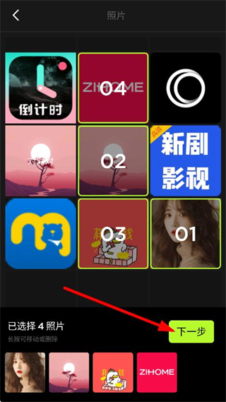 2、在照片選擇頁(yè)面,選擇照片后,點(diǎn)擊下一步,進(jìn)入拼貼編輯頁(yè)面。