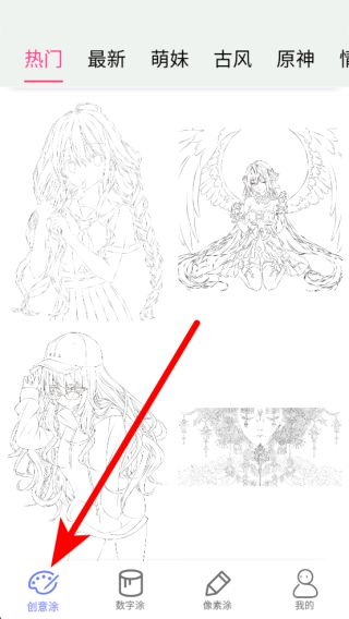 1、進(jìn)入應(yīng)用后,在圖案選擇界面,有熱門、最新等不同分類,從中挑選想涂色的線稿圖案,選定后進(jìn)入涂色頁面。