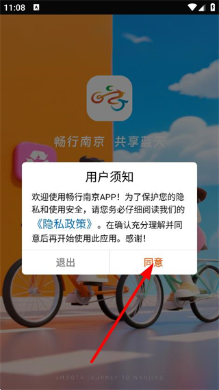 1、在用戶須知彈窗中,點(diǎn)擊同意,進(jìn)入暢行南京主界面。