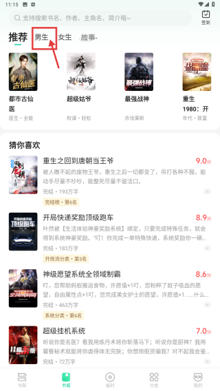 1、打開小說閱讀APP,點(diǎn)擊頂部男生分類標(biāo)簽,切換到男生小說推薦頁面。