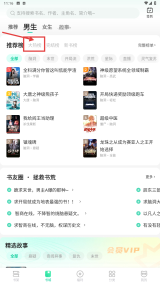 2、在男生小說頁面,點(diǎn)擊大熱榜分類,查看熱門男生小說列表。