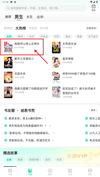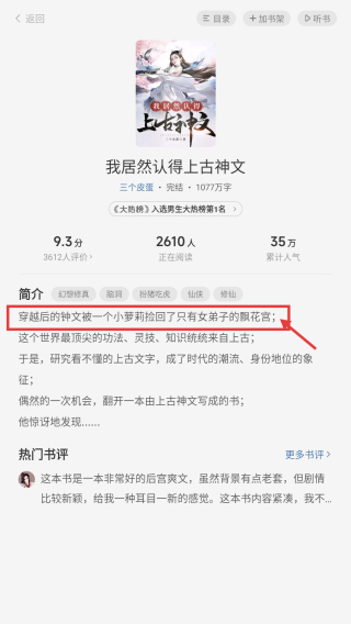 3、在大熱榜列表中,點(diǎn)擊我居然認(rèn)得上古神文小說條目,進(jìn)入小說詳情頁。